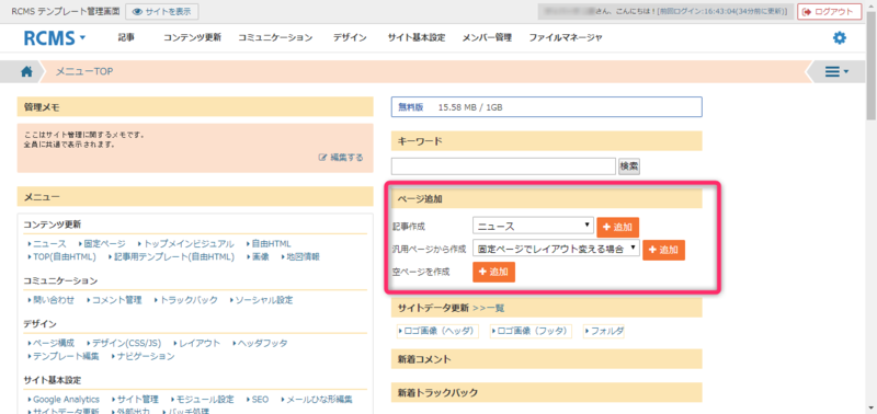 各項目を入力して、「追加する」ボタンをクリックし、ページを追加します。